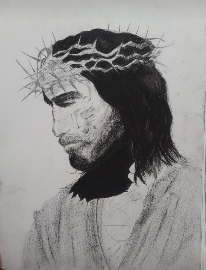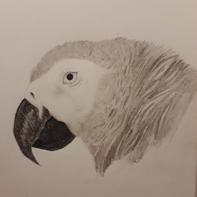 That one (drawing to left) was [me] just wanting to try out my charcoals ‘cause I just got them, and so really seeing how dark I could get her hair to be, and creating those nice soft shadows on her face was enlightening on how to properly use charcoal and it also taught me your photos look a lot better when you actually clean up the smudges around everything.